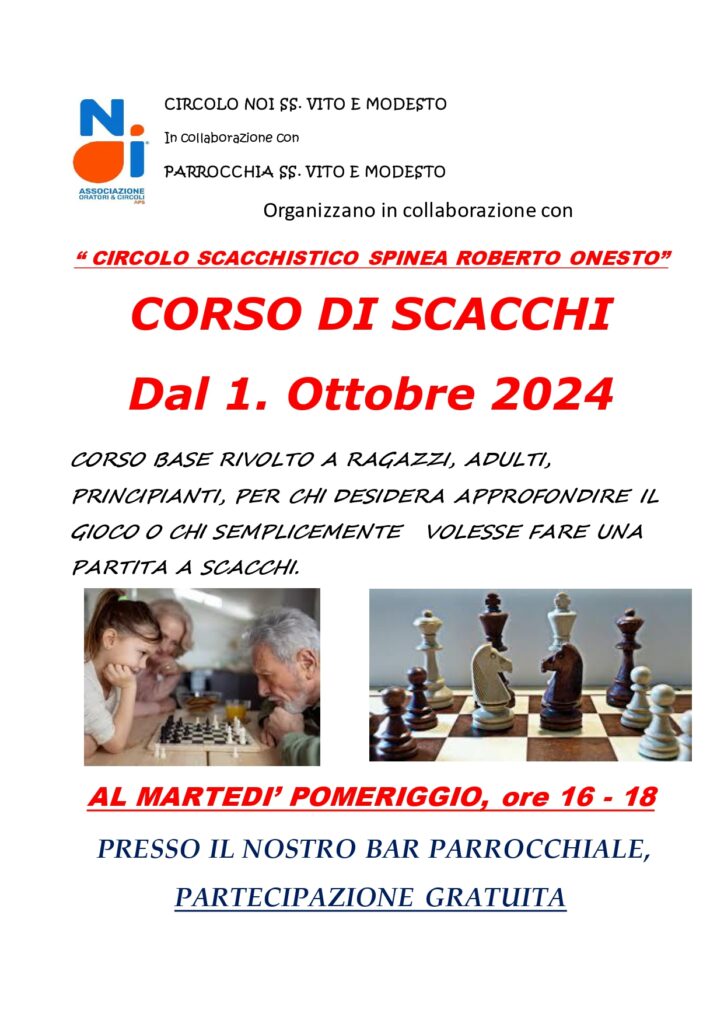 Al martedì il “CIRCOLO SCACCHISTICO SPINEA ROBERTO ONESTO” , dalle 16 alle 18 tiene un corso di SCACCHI rivolto a RAGAZZI, ADULTI, PRINCIPIANTI E QUANTI DESIDERANO APPROFONDIRE IL GIOCO O ANCHE SEMPLICEMENTE VOLESSE FARE UNA PARTITA A SCACCHI. LA PARTECIPAZIONE E’ GRATUITA.